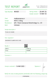 Each lot is sourced through our verified global supply chain with emphasis on traceability and quality control. We work diligently to obtain and maintain third-party analytical reports (HPLC/LC-MS) and Certificates of Analysis for each batch, as part of our ongoing quality process. These documents are reviewed internally and displayed as they become available. Independent third-party testing is also performed on select lots to confirm identity, purity, and alignment with our internal specifications.