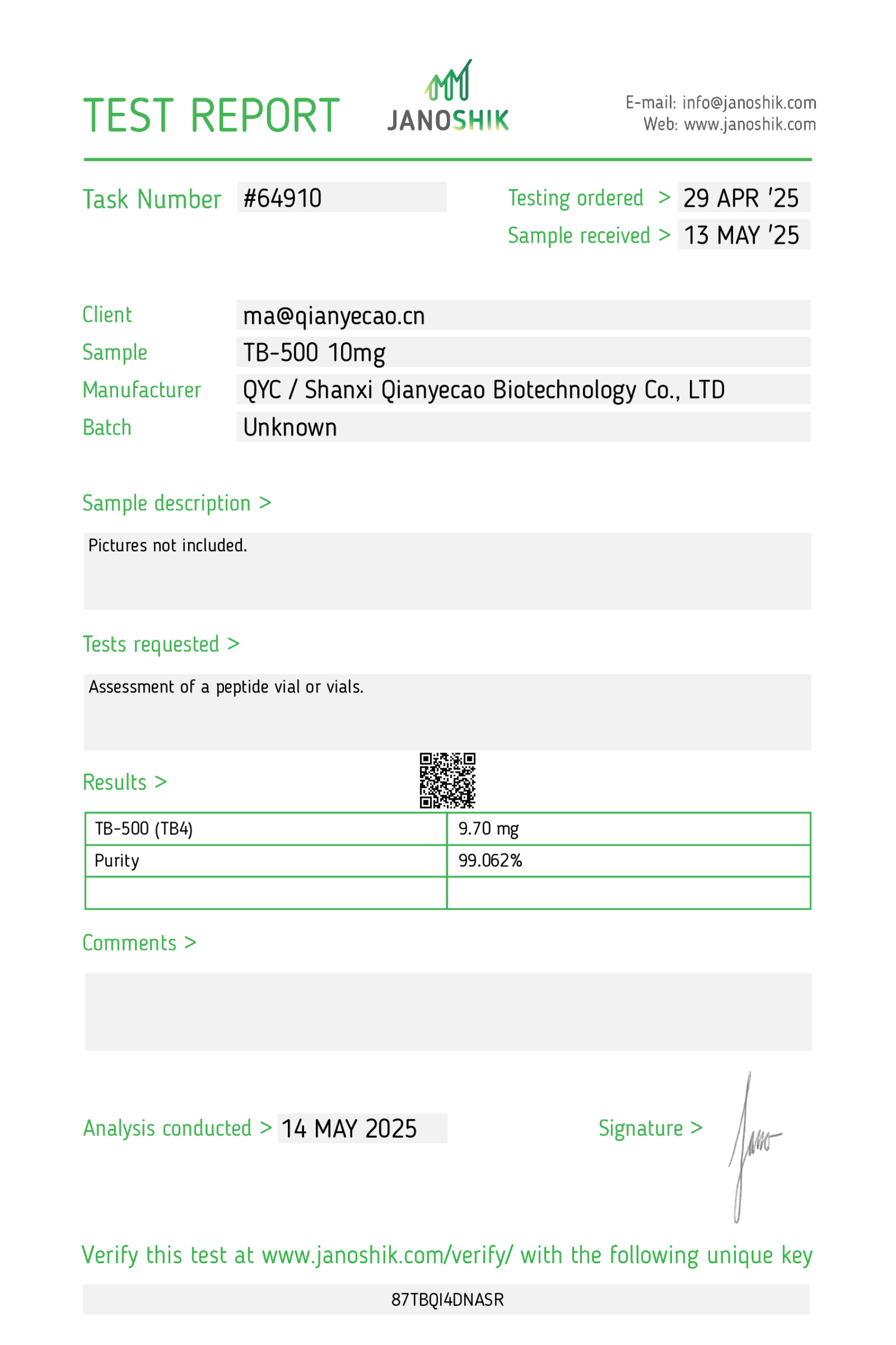 We require a verified purity of 99% or higher and perform independent third-party spot testing to confirm that select lots meet our internal standards for identity, purity, and composition. Where available, endotoxin testing results are included on Certificates of Analysis to verify laboratory purity; their inclusion is for research quality assessment only and does not imply suitability for human or veterinary use.